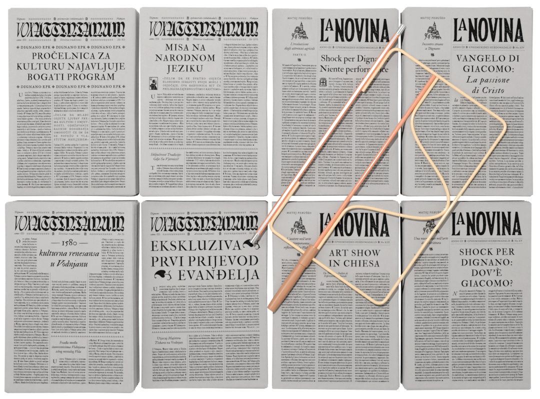 NVFV ekipa je koristila Fzn Forum u vizualu za prikupljanje sredstava za novi film. Ali ne paše. Ne može to tako. Napraviti ćemo novi daj. Pa se nešto slagalo, pa je ispalo da trebaju neke novine. Pa men. Napraviti ćemo font za novine. Napravili Fzn Erik, napravili i za logotipe u glavi novina lettering, koristili i IM Fell (Igino Marini), dali AI da napiše članke (neke po naslovima, a neke rendom priče), prelomili pa isprintali. Na hrvatskom VoxAttinianum (Glas Vodnjana) i na talijanskom LaNovina (Novina).